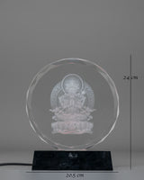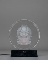 The design of the Chenrezig Glass Art features a detailed image of Chenrezig, seated in the lotus position, with his multiple arms extending in various mudras, symbolizing the boundless reach of compassion. The glass material adds a luminous quality to the piece, enhancing the beauty of the finely etched design. The background includes intricate motifs representing the infinite nature of compassion and the transformative power of love and kindness. The wooden base not only adds stability but complements the elegance of the glass, allowing the light to illuminate the details of the engraving, further enhancing its spiritual significance.