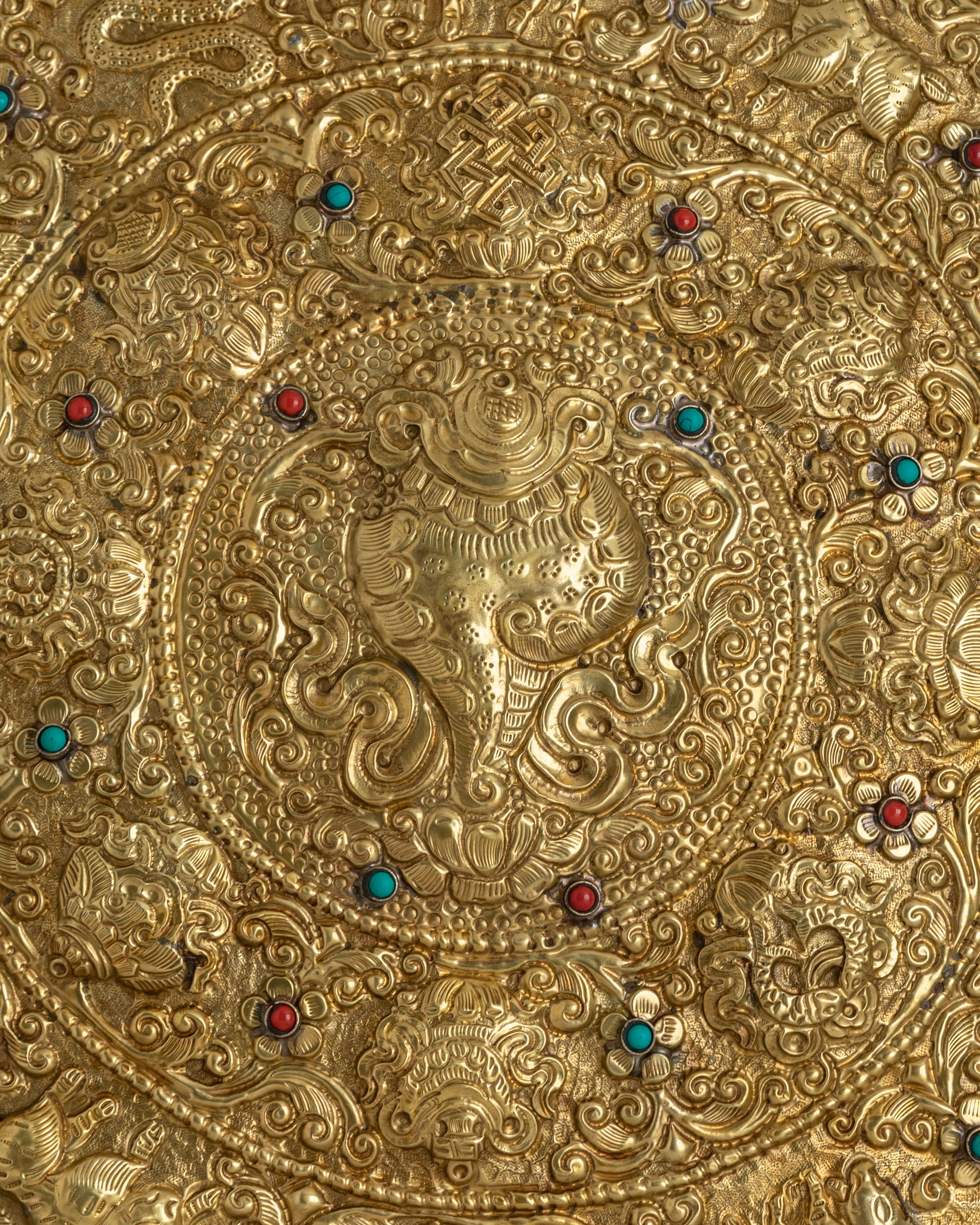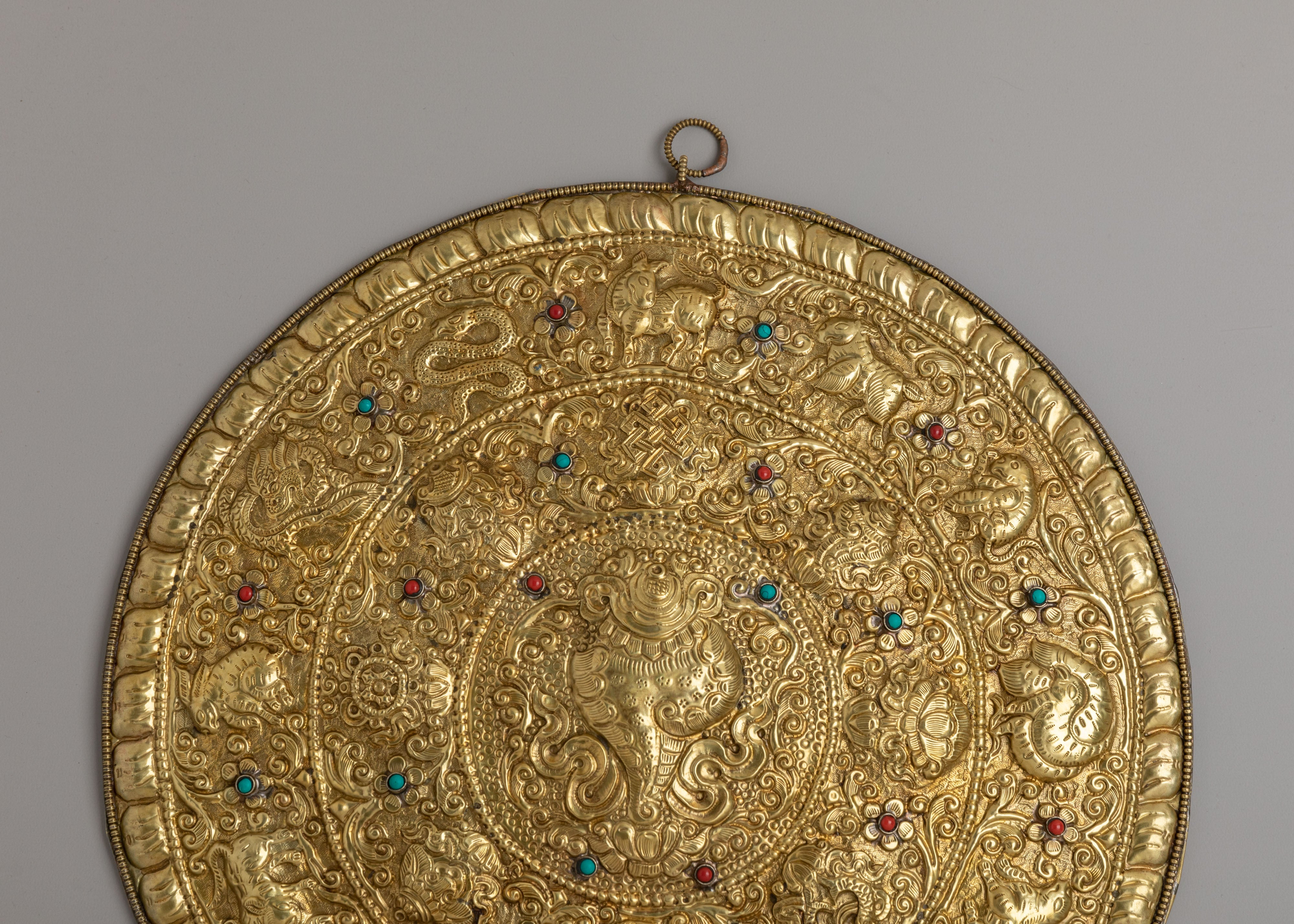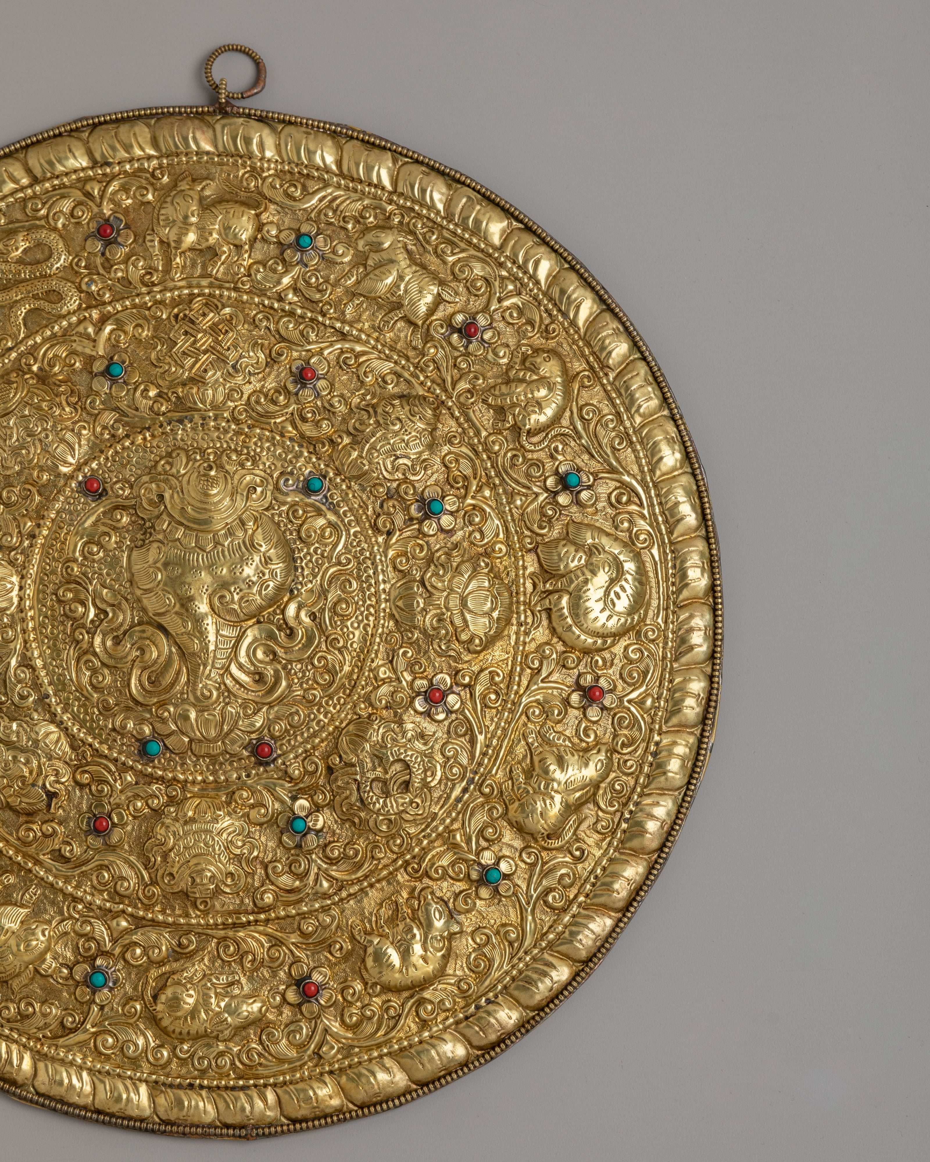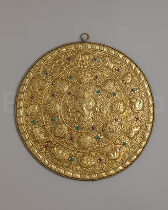 The central conch represents purity and the sacredness of sound in Buddhist and Hindu rituals, symbolizing the opening of spiritual pathways and the spreading of divine teachings. The gemstones inlaid within the design bring an added layer of beauty and energy, each representing a different aspect of spiritual significance and healing. Surrounding the conch, you’ll find auspicious symbols representing prosperity, protection, and harmony. The outer circle of the mandala is adorned with the Chinese zodiac, adding another layer of spiritual depth and cosmic balance to the piece. The combination of brass and gemstones creates a contrast, bringing both beauty and energy to your space.