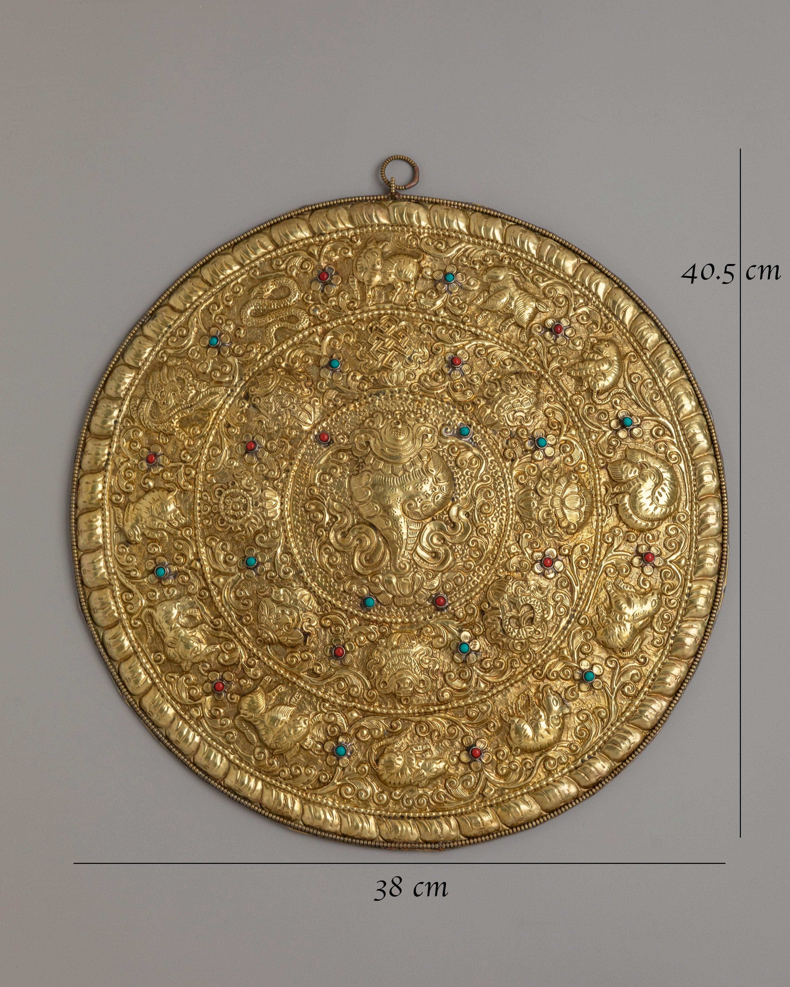 This Conch Mandala Wall Hanging is a beautifully crafted spiritual piece designed to bring balance, peace, and positive energy into your home or sacred space. Measuring 40.5 cm in height and 38 cm in width, with a weight of 0.98 kg, this wall hanging is made from brass and gemstones, creating a vibrant and sacred presence. At the heart of the design is the conch, symbolizing spiritual awakening, divine truth, and the sound that announces the start of sacred rituals. The conch is surrounded by auspicious symbols and the Chinese zodiac, which enhances the cosmic energy of the mandala, creating a powerful spiritual atmosphere.