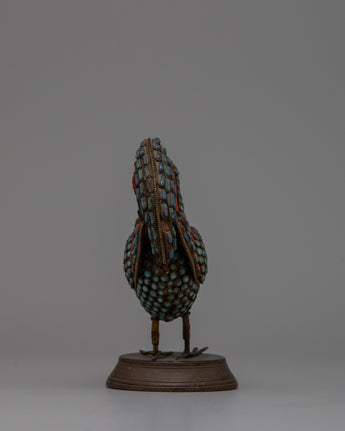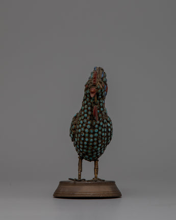 Introducing our beautifully produced Copper Rooster, which has a wooden base and an incredible copper body. This item weighs 0.142 kg and is 13 cm tall by 11 cm in the base. With its artificial turquoise, coral, and lapis lazuli details, it radiates elegance and historical significance.