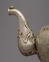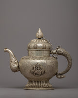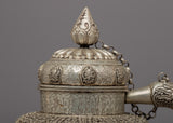 Tea in Tibet was an important staple in the diet. The tea was made from Chinese black tea bricks. Butter from yaks and salt were then added and churned together to give a thick, soup-like liquid. This was drunk throughout the day by all social classes. This teapot would have come from an aristocratic family or perhaps a wealthier monastery. There are some minor dents associated with age and use and an overall excellent patina.