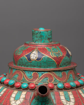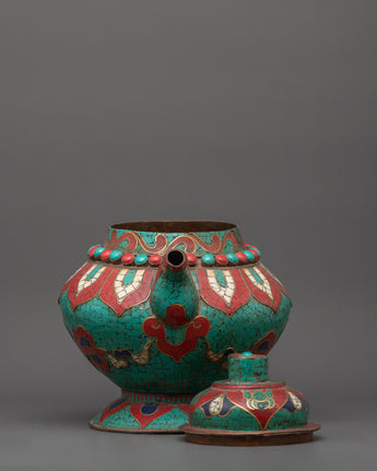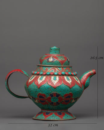 The handmade copper teapot is a wonderful example of Tibetan workmanship. This enormous copper teapot is intended for decorative purposes, measuring 26 cm in height and 32.5 cm in width. The elaborate embellishments of imitation coral and turquoise stones offer a touch of refinement to the copper kettle, making it ideal for tea lovers and collectors.