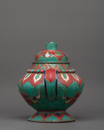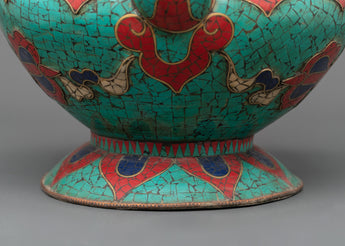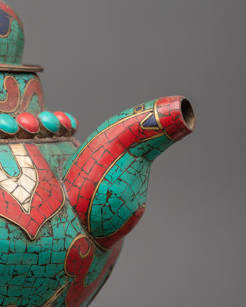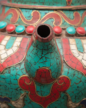 This traditional Tibetan teapot is expertly constructed and displays the cultural heritage of Himalayan handicrafts. Copper, recognized for its natural antimicrobial and heat-retaining characteristics, keeps your tea warm for longer. The intricate carvings and stone inlays of turquoise and coral represent prosperity and spiritual harmony, making this teapot an appropriate addition to meditation rooms and holy altar collections. Whether used to serve tea or as a decorative element in your house, this artisan copperware combines beauty and history.