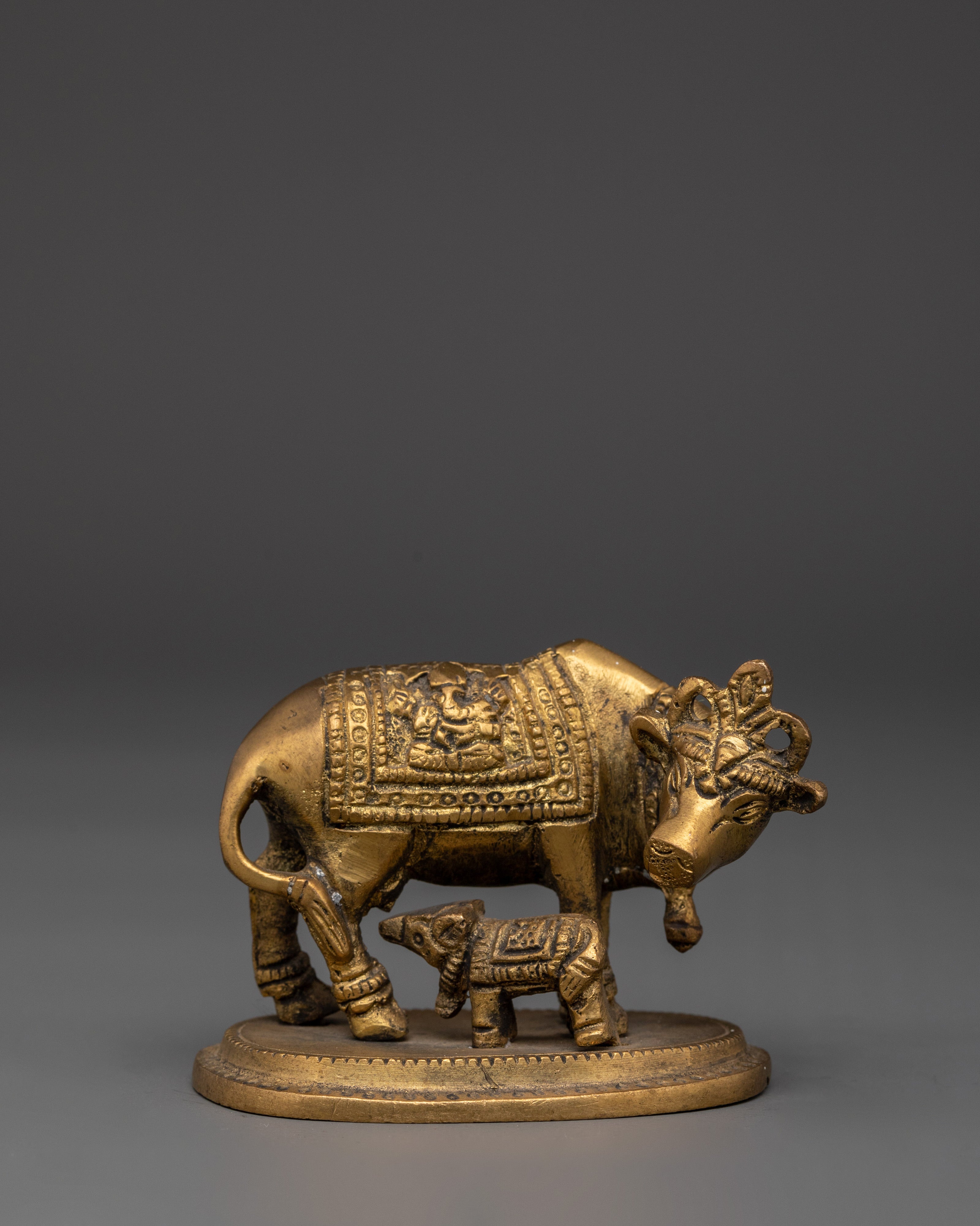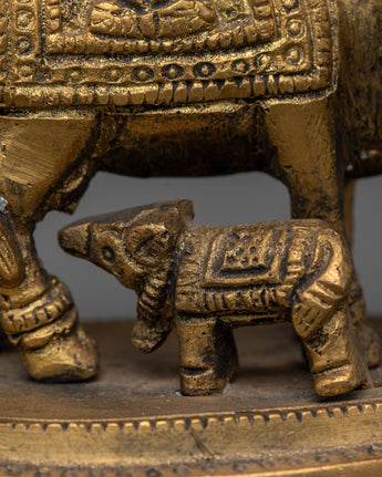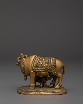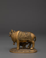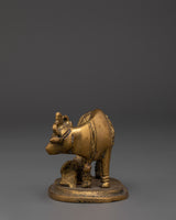 In Hinduism, the cow, known as "Kamadhenu," is revered as a celestial entity who grants desires and bestows prosperity and serenity. This sculpture's intricate workmanship, from its serene facial expression to the complex carvings on its body, represents patience, kindness, and nurturing energy. The polished brass surface heightens its sacred appeal, combining artistic beauty and spiritual connotation in a single beautiful item.