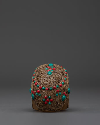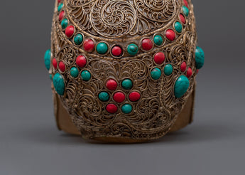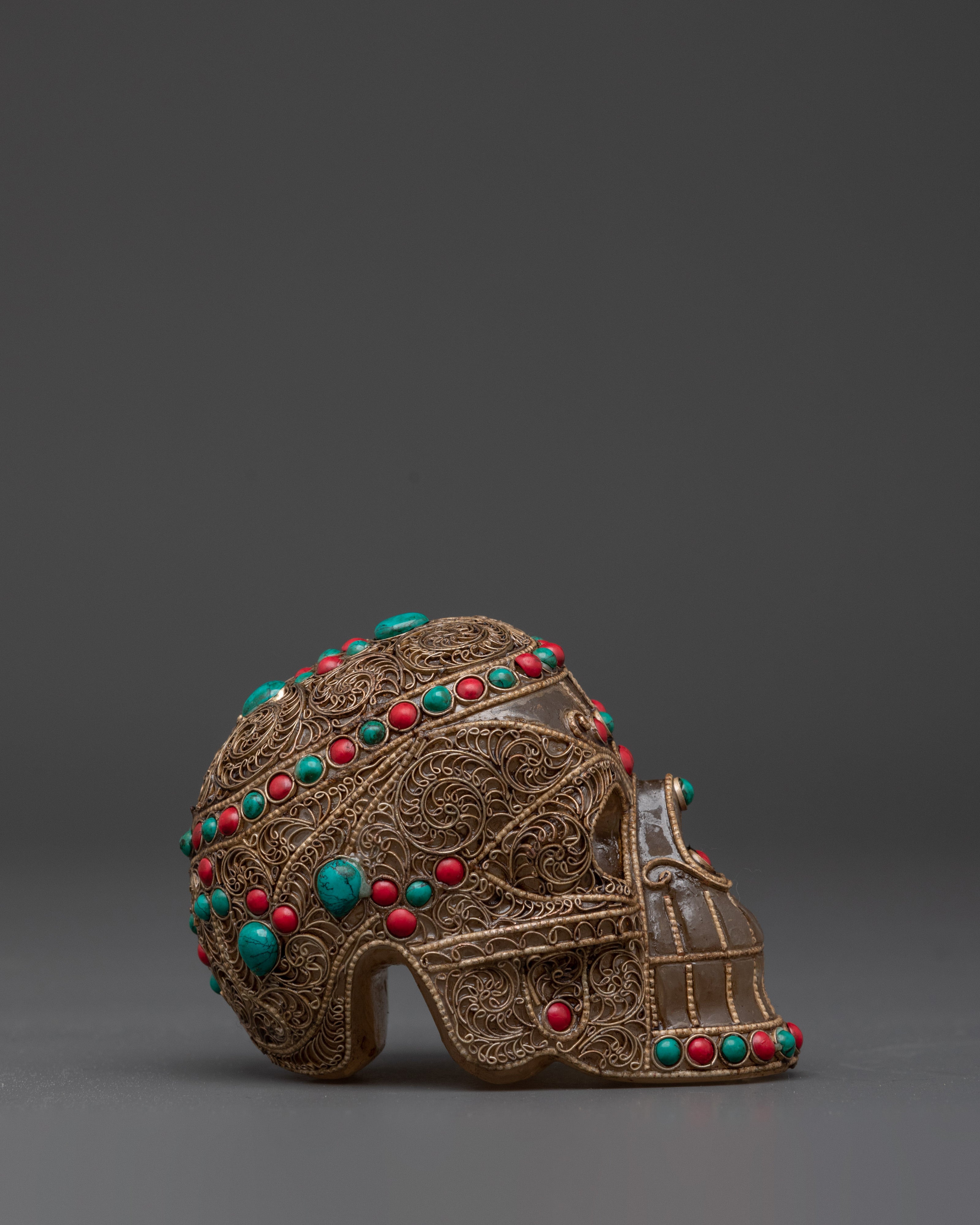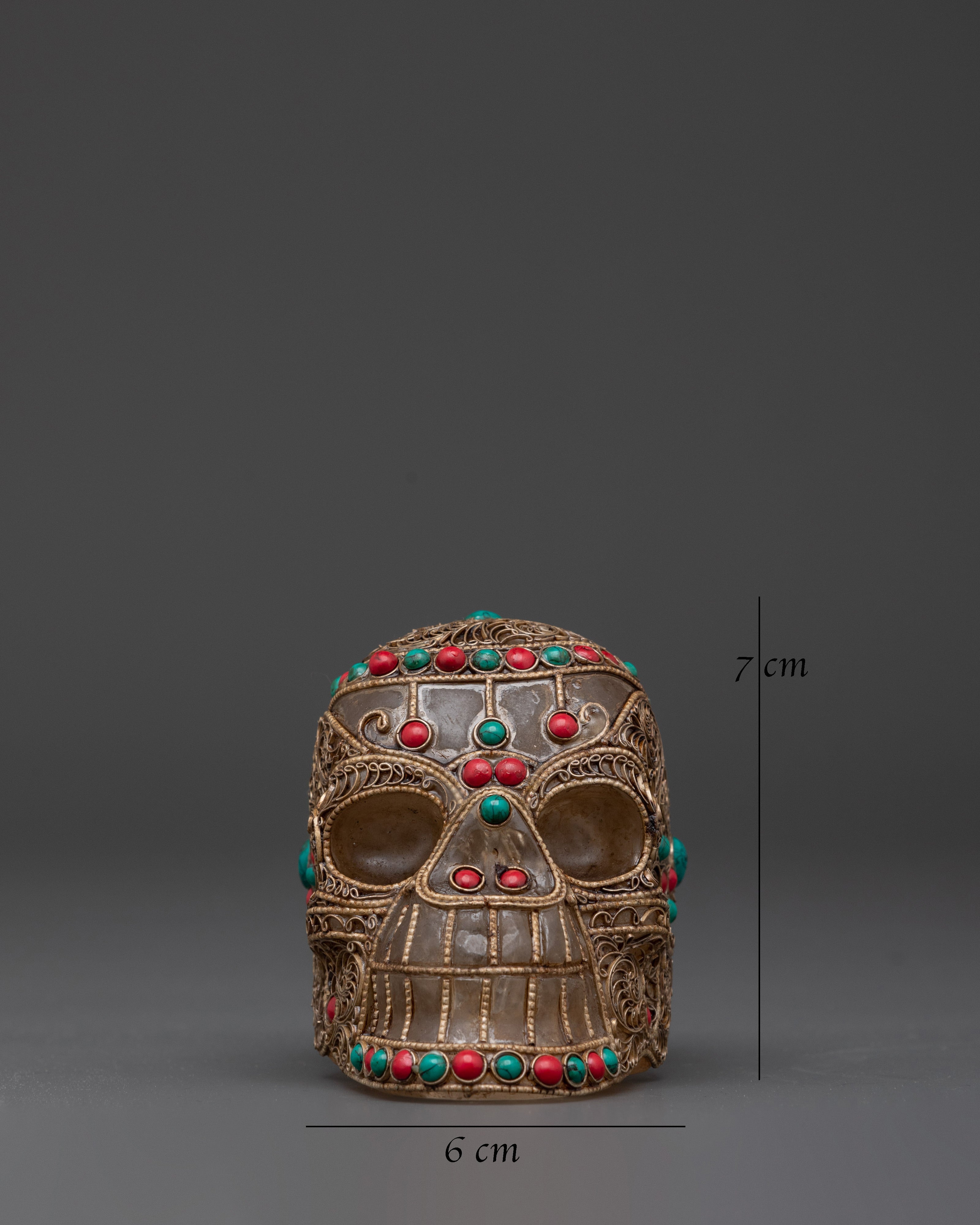 The Crystal Skull is expertly handcrafted, featuring delicate wirework and coral and turquoise stones set along the forehead, jaw, and around the eyes. These stones are known for their metaphysical properties: coral symbolizes vitality, protection, and emotional healing, while turquoise is associated with spiritual balance, wisdom, and healing energy. The crystal itself enhances the clarity and purity of the piece. At the same time, the skull design serves as a powerful symbol of mortality, transformation, and the impermanence of life, encouraging reflection and spiritual growth.