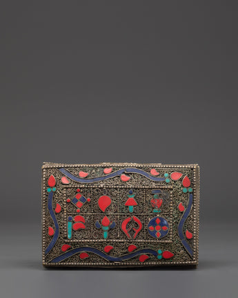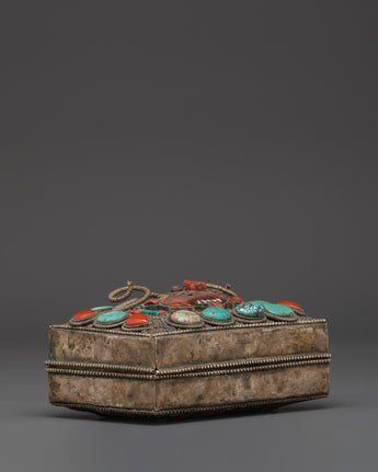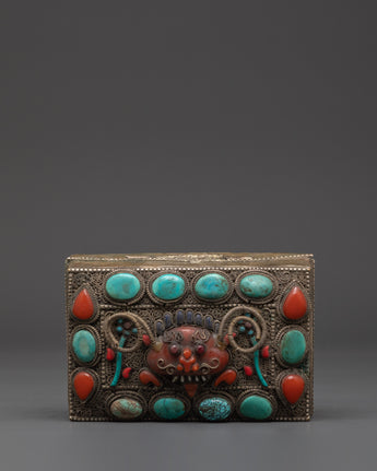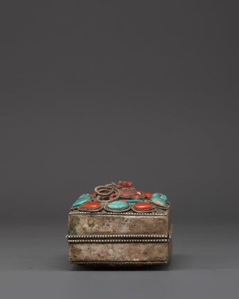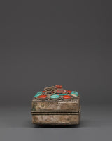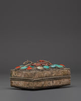 Handcrafted from copper and finished with silver plating, this box has ornate filigree detailing and striking inlays of turquoise and coral, both stones revered in Tibetan culture for their healing and protective properties. Measuring 8cm in height and 14.5cm in width and weighing 0.56kg, every detail, from the intricate patterns to the sacred stone placements, evokes spiritual reverence and beauty. Whether used in ritual practices or as a decorative storage solution, the Tibetan Decorative Altar Box is a powerful addition to any spiritual collection. It represents the safeguarding of wisdom, prayers, and sacred intentions, making it an ideal gift for meditation practitioners, Buddhist devotees, or collectors of Himalayan art.