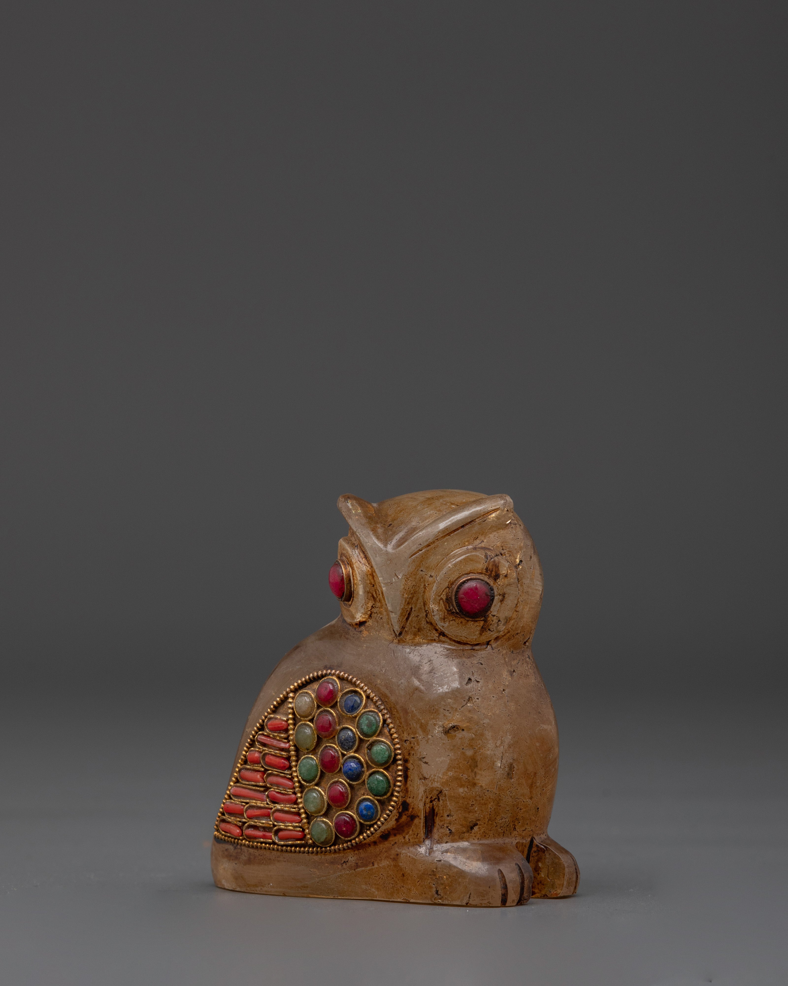 The glittering crystal material adds to its aesthetic appeal by capturing and reflecting light, bringing vitality to any room.  The faux stone detailing gives texture and depth to this handcrafted owl, giving it a lifelike appearance with artistic appeal.  This owl statue, whether displayed in a living room, study, meditation nook, or office, is both a clever decorative item and a symbolic talisman that promotes inner clarity, intuition, and awareness.  It also makes a thoughtful present for anyone who like spiritual art or animal symbolism.