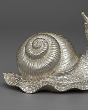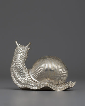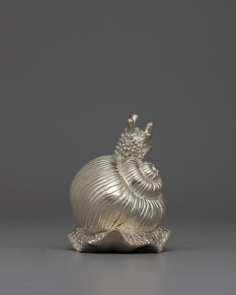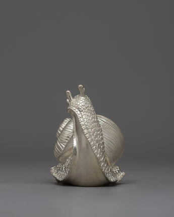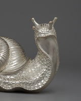 The exquisite combination of skill and elegance in this Decorative Silver Snail has been designed to enhance the visual appeal of any interior area. This item has a copper body that has been carefully plated in electro silver, and the fine workmanship really makes it come to life. The snail's shell's elegant curve and spiraling ridges are evidence of expert craftsmanship. Its stunning quality is enhanced by the way each curve and shape catches and reflects light, giving it a vibrant presence wherever it is placed.