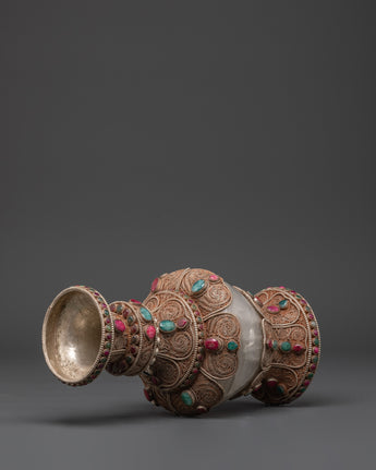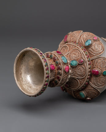 This beautiful flower vase exhibits traditional workmanship and cultural heritage. Its elaborate craftsmanship and gemstone inlays set it apart, whether used for fresh flowers, dried arrangements, or ritual sacrifices. Its silver-plated surface raises the energy of the environment, which is thought to invite purity, clarity, and spiritual serenity. Whether you're performing daily rituals or decorating your house, this vase combines beauty and function in a really polished design. The ruby and emerald stones offer a regal touch while also representing love, vitality, and spiritual richness.