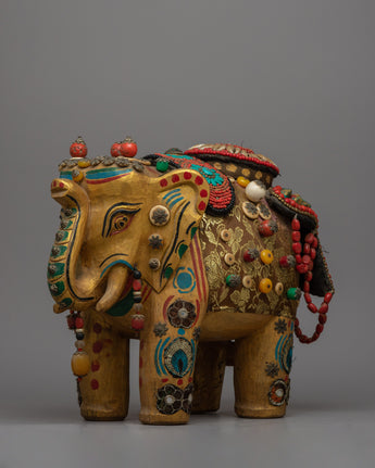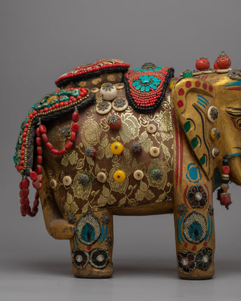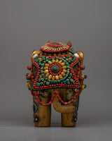 Presenting the Elephant Wood Statue, a masterfully handmade object that radiates beauty and majesty. This gorgeous statue is made of wood, has ornamental stones on it, and measures 28.5 cm in height by 32.5 cm in width. It weighs a massive 3.41 kg. The majesty and grace of the elephant, which is revered in many cultures as a sign of luck, strength, and wisdom, are captured by the fine craftsmanship and intricate details.