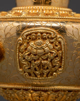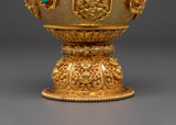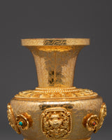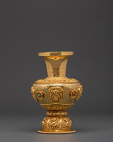 Measuring 17cm in height and 11cm in width, and weighing 0.73kg, this vase carries both elegance and deep symbolic value. The gold-plated surface represents purity and wisdom, while the copper base reflects traditional Himalayan craftsmanship. Used in puja ceremonies and meditation spaces, it holds flowers and offerings that embody devotion and respect for the Buddha and deities. Beyond its ritual purpose, it also serves as a meaningful piece of spiritual decor for altars, homes, or meditation rooms.