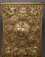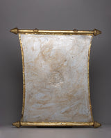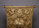 A metal thangka is a type of thangka painting that is made on a metal surface rather than on traditional canvas or paper. Metal thangkas are often made using copper, brass, or silver and are usually decorated with intricate designs and Buddhist iconography using a technique called repoussé. This involves hammering the metal from the reverse side to create a raised relief image on the front. Metal thangkas are known for their durability and are often used in ritual contexts or as decorative pieces in Buddhist homes and temples. They are particularly common in Tibet, where they have been produced for centuries.