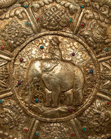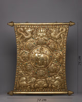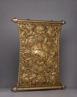 The Four Harmoniuos Friends A fascinating work of spiritual art painstakingly fashioned on brass is the Metal Thangka. The Four Harmonious Friends, an old Buddhist story that stands for cooperation, harmony, and respect for one another, are depicted at the heart of the painting. The piece's visual appeal and spiritual importance are further enhanced by the auspicious symbols that surround the primary motif.