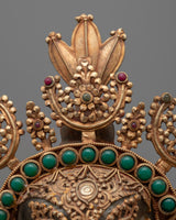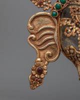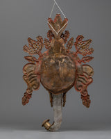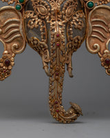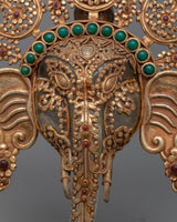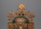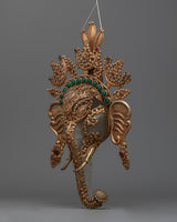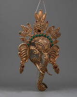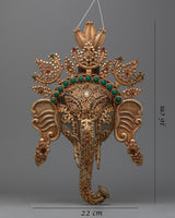 The Ganesh Crystal Mask is a magnificent illustration of conventional workmanship that combines spiritual symbolism with artistic expression. This mask is beautifully completed with electro-gold plating and handcrafted on a copper body, giving it an opulent and brilliant appearance. It is 36 centimeters tall and beautifully embellished with semi-precious stones, such as vivid turquoise, rich coral, and shimmering crystals. In addition to adding to the mask's aesthetic appeal, these stones have profound spiritual significance.
