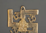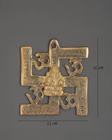 This Ganesh Om Swastik symbol Wall Hanging is 15cm tall and 13cm wide and weighs 0.42kg. The sculpture, expertly crafted from sturdy brass, features Lord Ganesha in its center, surrounded by sacred "Om" symbols and the auspicious Swastik design, a valued emblem in Hinduism said to bring wealth and confidence.