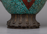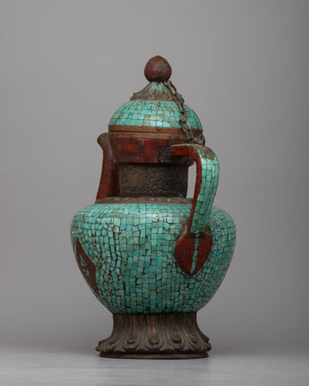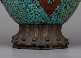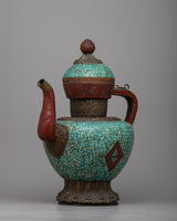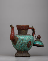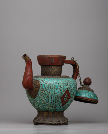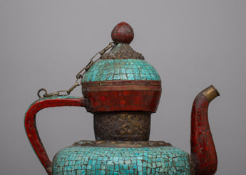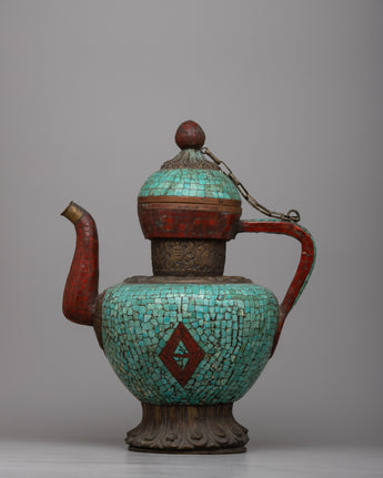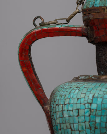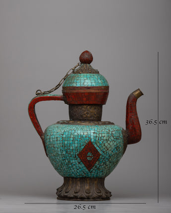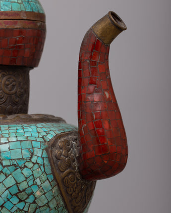 Presenting the Gemstone Tea Pot, an exquisitely crafted and visually stunning masterpiece. This gorgeous teapot, which is handcrafted with a copper body, has cut coral and turquoise stones inlaid on its outermost layer, which gives its design a hint of organic beauty. Standing at a height of 36.5 cm, it is an eye-catching ornament that can be used to improve the atmosphere of any area.