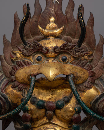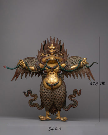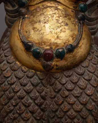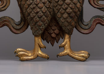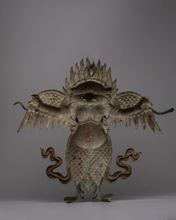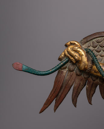 Presenting the magnificent handcrafted Garuda God Wall Hanging embodies the regal might and spiritual importance of the sacred eagle found in Buddhist and Hindu mythology. This wall hanging is an astounding 47.5 cm high, with a gorgeous gold coating and a copper body. The extraordinary craftsmanship and profound care with which this sculpture was made are evident in the minute details of Garuda's furious countenance, strong wings, and regal stance.
