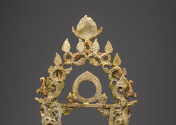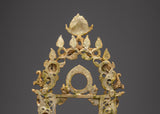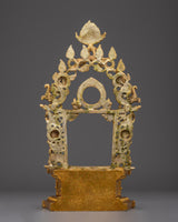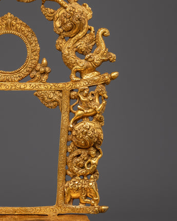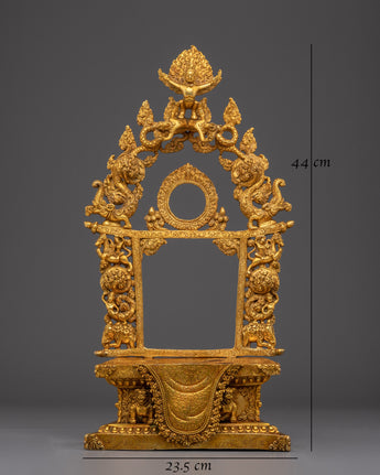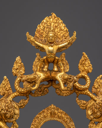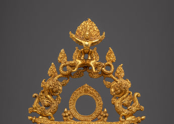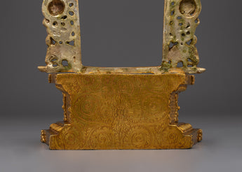 This handcrafted gold-plated copper throne featuring Garuda is a powerful symbol of reverence, crafted to elevate sacred deity statues. Topped by Garuda, the legendary protector and obstacle remover, the throne exudes divine strength and protection. Detailed with auspicious motifs, dragons, and guardian figures, it captures the essence of Buddhist ritual artistry. Perfect for temples, monasteries, and shrines, this throne enhances the sacred aura and honors the divine presence of the deity it supports.