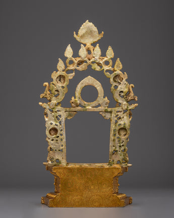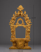 Expertly handcrafted with a gold-plated finish, this sacred copper throne exudes a divine ambiance that enhances any altar or meditation space. The intricate symbolic designs embody prosperity, protection, and enlightenment, making it a profound centerpiece that elevates your spiritual practice. Featuring Garuda, the revered mythical protector, this throne invites blessings and powerful sacred energy, creating an environment ripe for devotion and mindfulness. Ideal as both a ritual object and a striking decor piece, it perfectly blends traditional craftsmanship with spiritual significance, offering both beauty and meaning to your sacred setting.