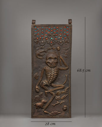 This stunning Gold-Polished Citipati Wall Hanging is a significant symbol of Tibetan Buddhist adoration and artistic ability. This handcrafted sculpture, 68.5cm tall and 28cm wide, depicts the celebrated dancing skeleton deities Citipati, who are respected as protectors of sacred areas and powerful representations of impermanence. It is made of strong iron, polished with a stunning gold finish, and decorated with delicate gem beading detailing, which adds lively energy to its spiritual design.