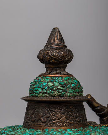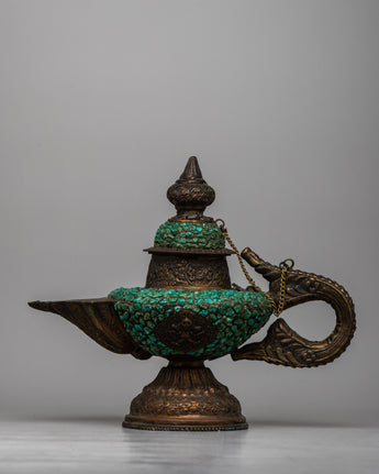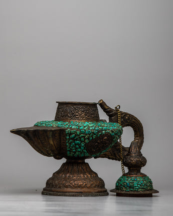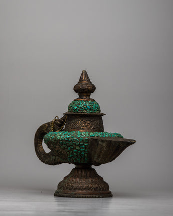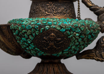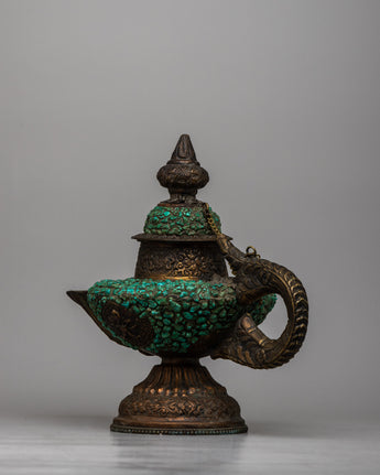 The elegant Tibetan Green Tea Pot will give a touch of elegance to your decor. It is a masterwork made of copper and beautifully embellished with enchanted aladdin stones. Its attractiveness is increased by the addition of genuine turquoise stones, which produce a breathtaking appearance that will enthrall anybody who sees it. This tea pot is more than just a pretty object; it's a statement piece that enhances your living area by skillfully fusing creativity and utility.