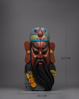 Presenting the Guan Gong Yu face mask: a remarkable combination of ancient wisdom and expert craftsmanship. This item, which is handcrafted from wood and has elaborate acrylic hand painting on it, is 51.5 cm tall by 25.5 cm wide and weighs 1.306 kg.