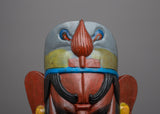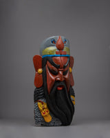The mask captures the bravery and nobility of Guan Gong Yu through intricate carving and empathetic painting, embodying the legendary hero. Each brushstroke gives his recognizable characteristics more depth, transforming this piece from a decorative object into a metaphor for strength and defense.