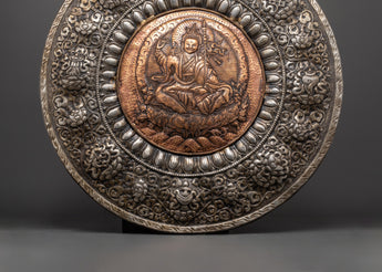 This Tibetan Buddhist wall hanging, crafted with rich workmanship, illustrates the Himalayan artists' deep artistic heritage. The combination of iron and copper represents strength and transformation, resulting in a spiritually charged artifact with increased positive energy. Whether displayed as a focal point in your home, temple, or meditation space, this Guru Rinpoche wall art reminds you of enlightenment and divine direction.