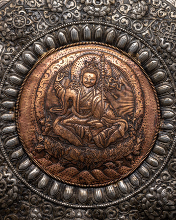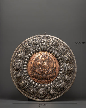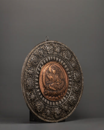 Guru Rinpoche Wall Hanging is a religious depiction of Padmasambhava, the respected teacher of Tibetan Buddhism. This stunning wall art, expertly handcrafted from iron and copper, represents Guru Rinpoche's knowledge, protection, and spiritual power, making it an ideal addition to your meditation room, shrine, or holy altar.