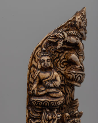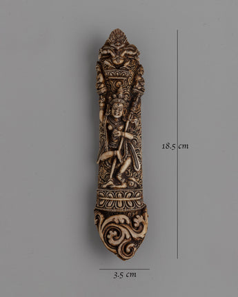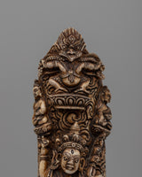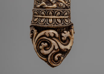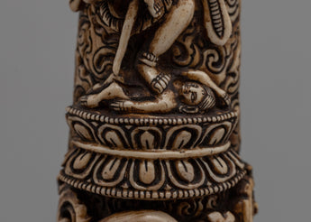 This finely carved Hand-Carved Buffalo Bone Vajravarahi Décor symbolizes an essential deity in Vajrayana Buddhism, known for her fundamental energy and wisdom. The sculpture represents Vajravarahi in her changing, wrathful form, complete with bone decorations, symbolizing her authority over impermanence and ego. Her furious embrace and dancing posture represent the active elimination of ignorance, giving her an important model for spiritual protection and guidance.
