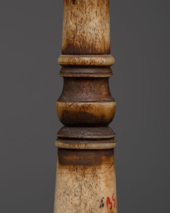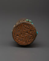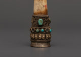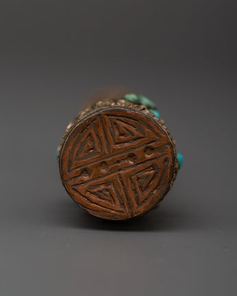 Stamps are valuable in ritual activities, and rituals indicate spiritual power and are frequently used to imprint holy symbols during gifts or blessings. The buffalo bone represents purity and impermanence, while the turquoise inlays are thought to provide protection and healing. This artwork combines meaning and craftsmanship, making it an effective instrument for utilitarian rituals and holy ornamentation.