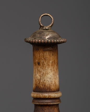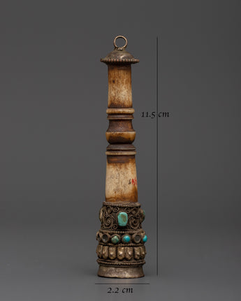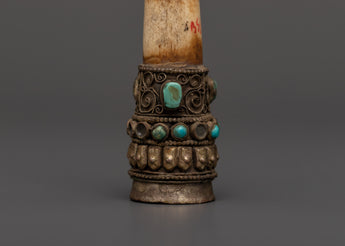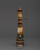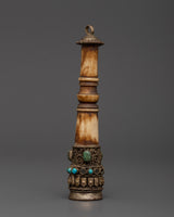 This Tibetan Ritual Stamp is a beautifully created spiritual implement, measuring 11.5cm in height and 2.2cm in breadth and weighing just 0.046kg. It is beautifully carved of ethically sourced buffalo bone accented with copper and intricate electro gold and silver plating. The base is embellished with embedded artificial turquoise stones, which provide both beauty and symbolic value in traditional Tibetan design.