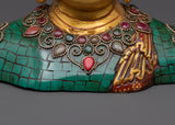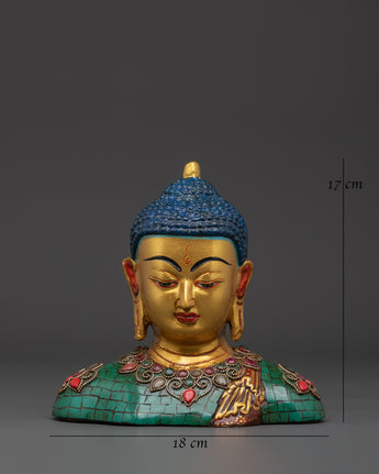 This handcrafted Buddha Head Sculpture depicts the tranquil essence of enlightenment and mindfulness, which is a sacred symbol of inner serenity in Tibetan Buddhist art. This intricately constructed statue is 17cm tall and 18cm wide, made of brass and embellished with brilliant coral and turquoise inlays. The placid facial expression, intricate crown, and traditional ornaments represent tranquillity and spiritual insight. This Buddha head is ideal for altars, meditation rooms, or sacred corners and promotes peace and positivity in any setting.