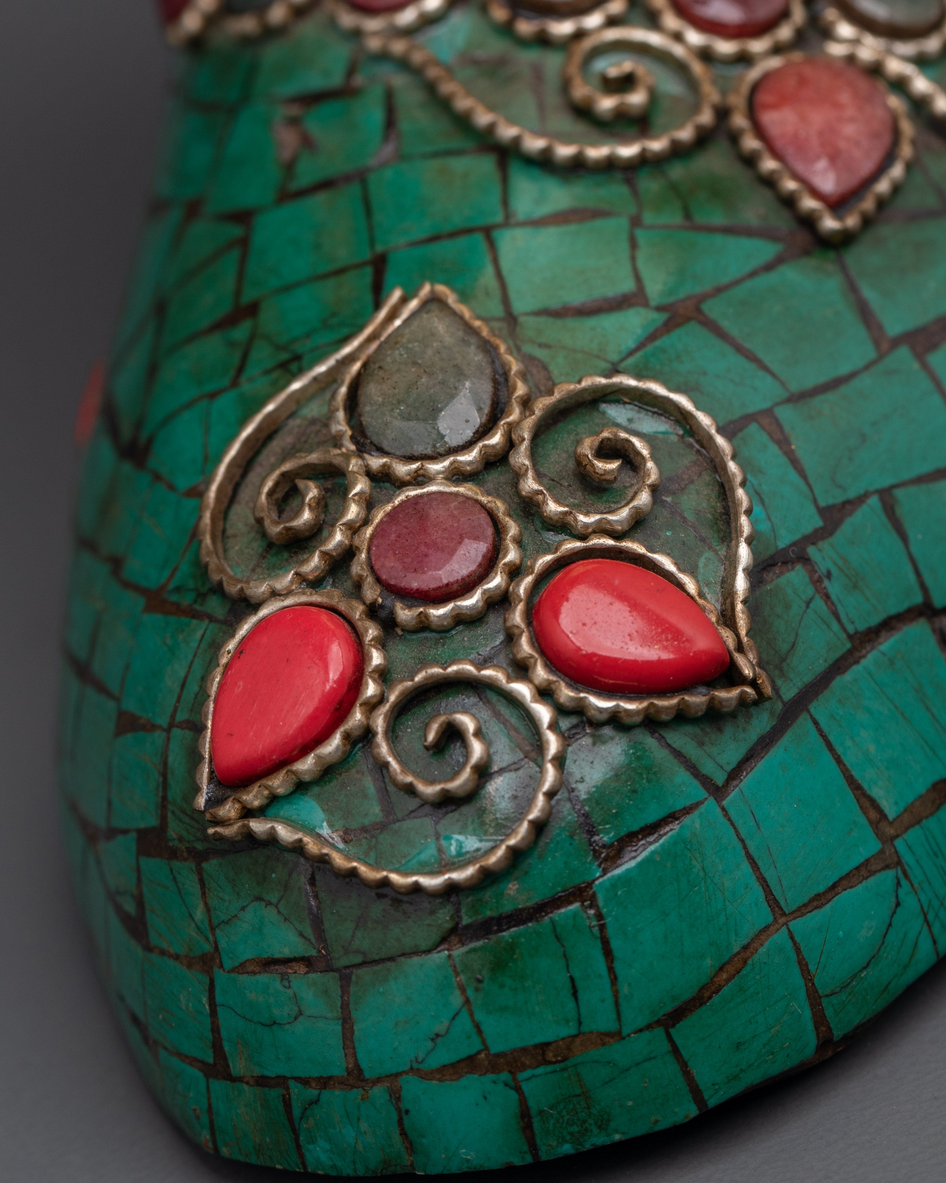 Each Buddha head sculpture is meticulously created by talented Himalayan artists who have inherited centuries of metalworking skills. Coral and turquoise are symbols of protection, healing, and mental and spiritual harmony. The smooth brass surface and delicate workmanship reveal the artistry behind this spiritual masterpiece, which serves as both a meditative focus point and a remarkable piece of home decor. Weighing 1.88kg, it adds a sense of grounded vitality and spiritual depth to any setting.