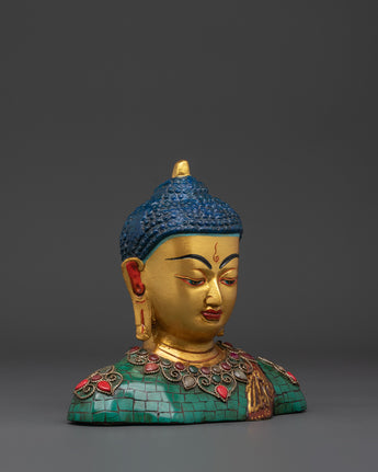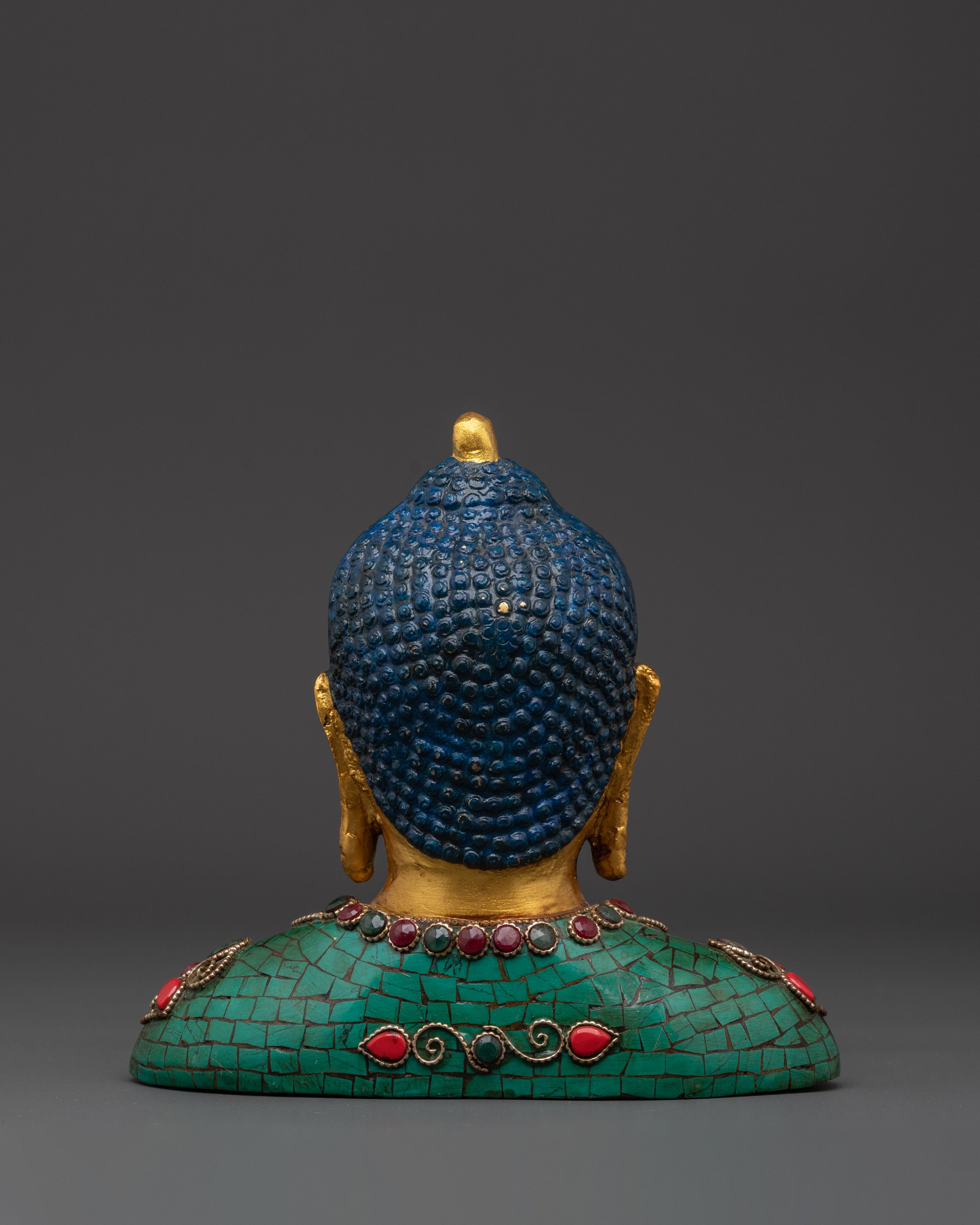 In Buddhist tradition, the Buddha's head symbolizes the enlightened mind and the path to enlightenment. This handcrafted Buddha Head Sculpture exudes tranquility, making it suitable for people seeking mindfulness and inner harmony. Whether placed on a shrine, desk, or display shelf, it promotes spiritual awareness and ornamental beauty. Its Tibetan brass craftsmanship, coral, and turquoise embellishments serve as a strong reminder of compassion, tranquility, and enlightenment.