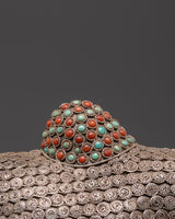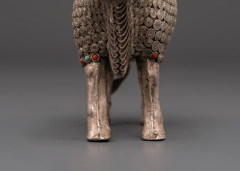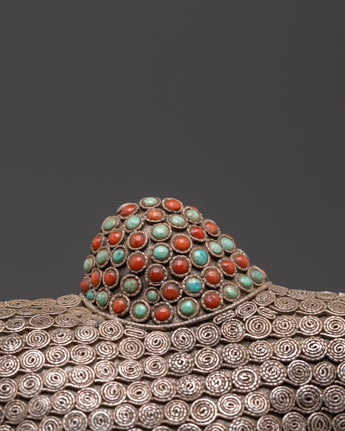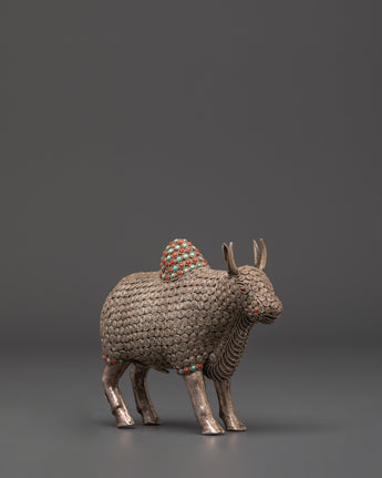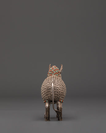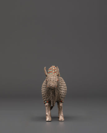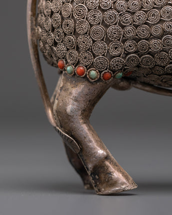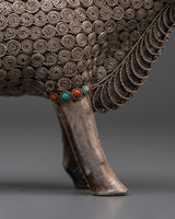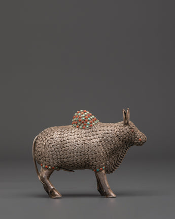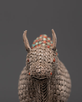 This handcrafted bull figurine is a fantastic piece of art that will add to your home decor. This exquisite sculpture, measuring 10.5 cm in height and 5 cm in width, is constructed of silver-plated metal and has complicated spiral motifs. The bull denotes strength, tenacity, and power, making it an excellent choice for any location that requires a forceful statement. This figure, which features coral and turquoise gemstone accents, adds color and meaning to your home, business, or personal collection.