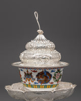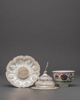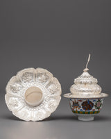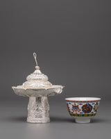 Every element demonstrates skillful craftsmanship and deep cultural symbolism. The elaborate patterns flow smoothly around the cup, with each design feature symbolizing blessings, protective energy, and spiritual intent. At 0.486kg, this ceremonial tea cup adds presence and significance to rituals and gifts. Whether used for traditional rites or displayed as a treasured piece of legacy, it exudes both beauty and cultural reverence.