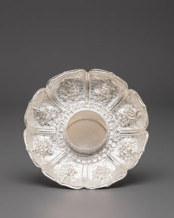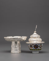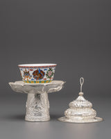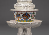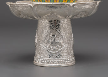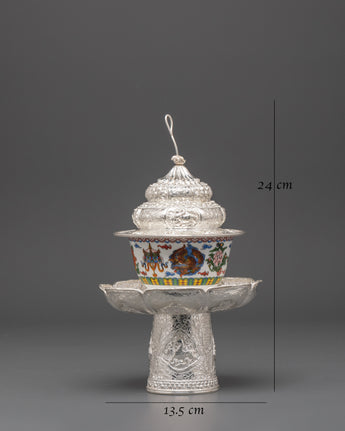 This handcrafted ceremonial tea cup is a demonstration of cultural creativity and spiritual significance. It is 13.5cm wide and stands tall with beautiful proportions, adorned with beautiful decorations inspired by auspicious symbols of prosperity, harmony, and holy heritage. It is ideal for spiritual ceremonies, offerings, and cultural events, but it also makes a stunning statement piece in any sacred or personal place.