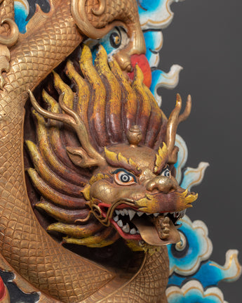 This dragon wall hanging is crafted with remarkable skill and elegance. The sculpture is made of repousse copper and hand-hammered to perfection, guaranteeing that each scale and curve is precise and graceful. The dragon's body is adorned with gold-plated details, which lend a touch of radiance and elegance. The combination of copper and gold produces a stunning contrast that highlights the dragon's colorful, dynamic motion, which is further enhanced by the clouds and orbs that surround it, resulting in a mesmerizing and magical design.