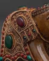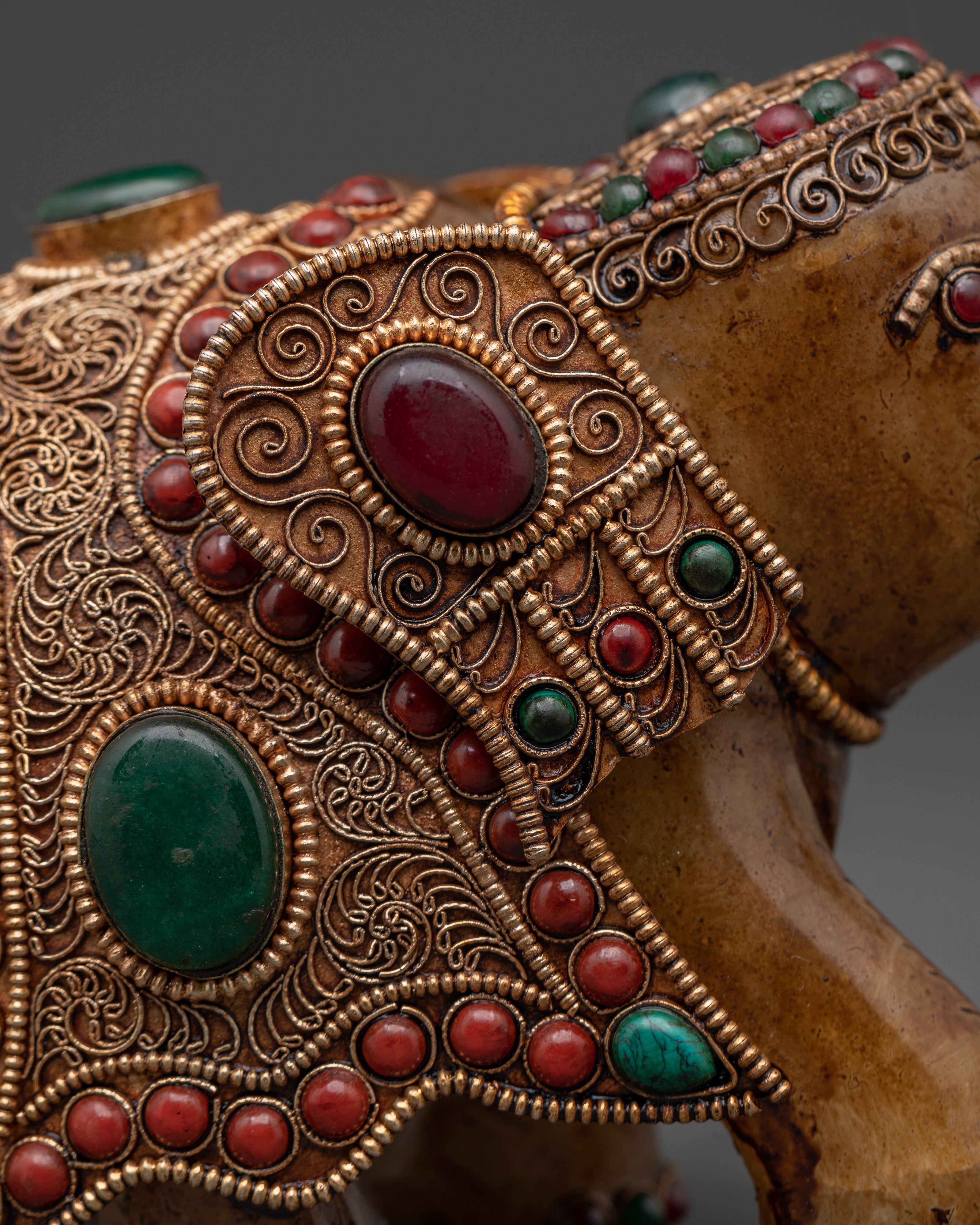 This handcrafted elephant figurine is a beautiful example of traditional craftsmanship and spiritual symbolism. It is expertly crafted from crystal, copper, and silver-plated materials, featuring delicate artistry that adds beauty and elegance to any setting. The figurine has been adorned with beautiful coral and turquoise stones, which add a flash of brilliant color and increase its overall appeal. Elephants are admired for their strength, wisdom, and good fortune; therefore, this sculpture is more than just a decorative object - it represents positive energy and a strong spiritual presence.