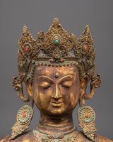 The crown is adorned with decorative motifs and colorful inlays that evoke cultural depth and sacred symbolism. The soft expression on the Buddha’s face reflects inner harmony, while the gold finish adds a radiant warmth. The oxidized finish introduces contrast and texture, enhancing the handcrafted feel of the sculpture.