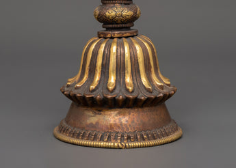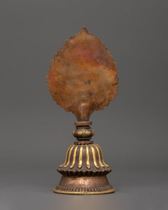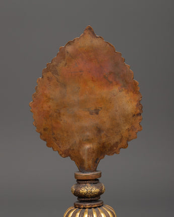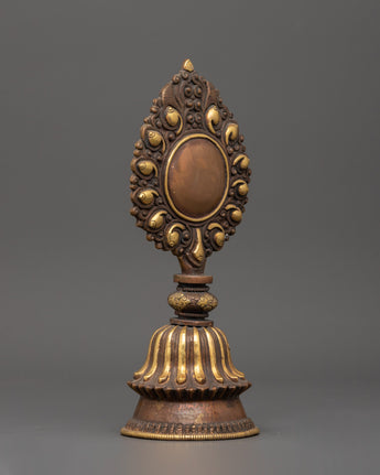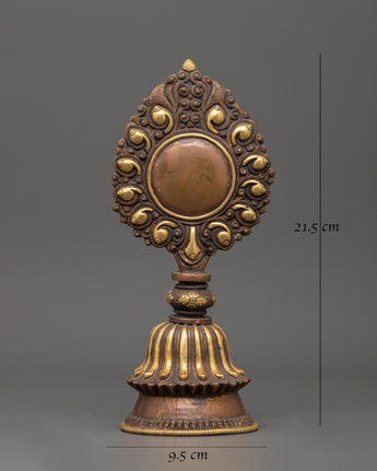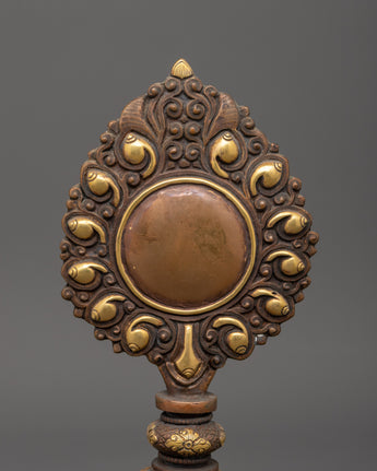 This handcrafted Newari artifact is a stunning example of traditional Newari craftsmanship, thoughtfully intended to complement your spiritual space. This exquisite relic, measuring 21.5 cm in height and 9.5 cm in width, weighs only 0.20 kg and is made of copper with gold plating, giving it a regal and classic aspect. The rich design reflects the Newari community's traditional past, which includes magnificent metalwork and spiritual symbolism. It is ideal for use as a ritual mirror and serves both ornamental and spiritual purposes, bringing true Nepalese creativity to your altar or meditation space.