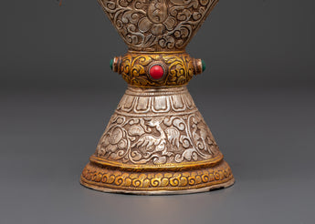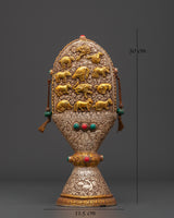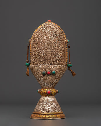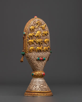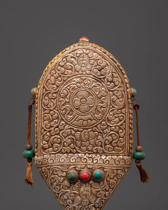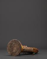 This Brass Stamp with Tibetan Loh (30cm x 11.5cm, 1.26kg) is a beautifully handcrafted ritual artifact featuring detailed animal zodiac carvings and symbolic floral patterns. Made with a white metal and brass body, it is further enhanced with artificial coral and turquoise inlay, reflecting both artistry and spiritual symbolism. In Tibetan tradition, the Loh represents the twelve zodiac animals, each linked to cosmic cycles of energy, protection, and destiny.