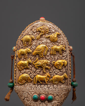 The face of the stamp is adorned with finely detailed animals, including the mouse, ox, tiger, rabbit, dragon, snake, horse, sheep, monkey, bird, dog, and boar, crafted in relief with golden brass against floral engravings. These zodiac animals are believed to offer guidance, protection, and balance, making this piece both a decorative treasure and a spiritual tool. Whether placed in a shrine, used as a ritual item, or displayed as traditional Himalayan art, it radiates cultural richness and sacred meaning.
