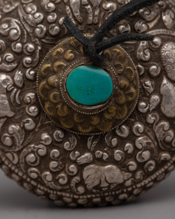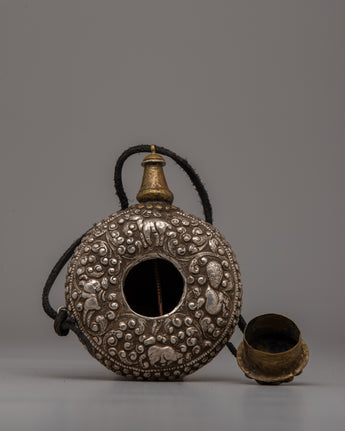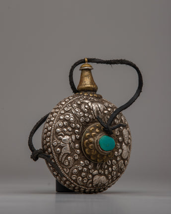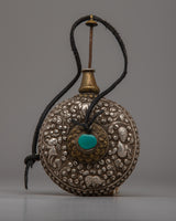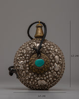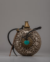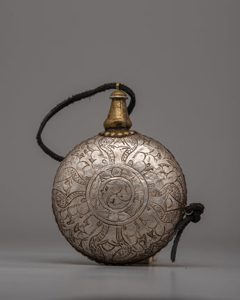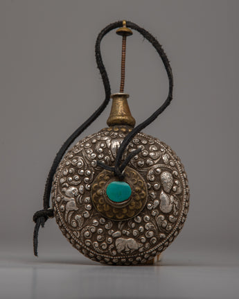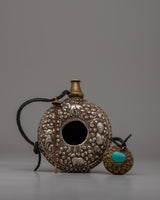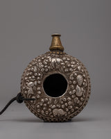 This Silver Decorative Snuff Bottle is a stunning combination of elegance and craftsmanship, intended for the refined connoisseur of traditional snuff storage. Crafted from high-quality Brass Covered With Silver, this snuff container combines classic style with Buddhist creativity. The inlaid beautifully matches the intricate carvings on its surface, creating a striking contrast that adds to its aesthetic appeal. At 12 cm in height and 10 cm in breadth, it exemplifies the mix of usefulness and beauty.