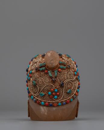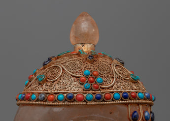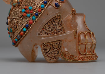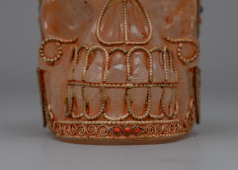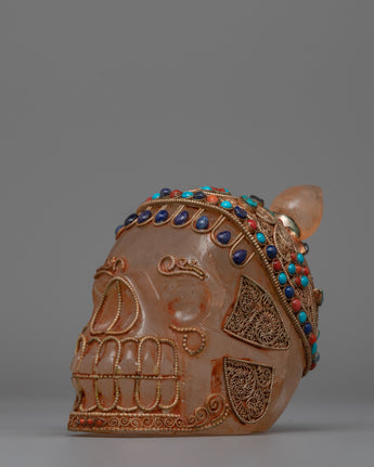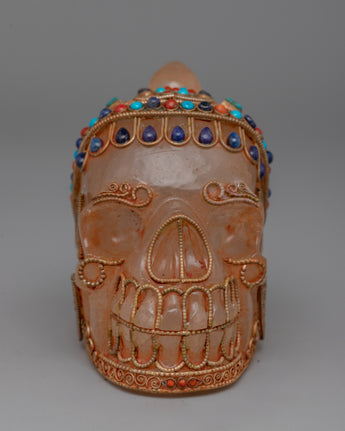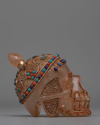 This beautifully created Tibetan Buddhist Skull Head is a stunning example of both artistic and spiritual workmanship. Crafted from pristine crystal, it reflects transparency and holiness, signifying wisdom and the transience of existence in Buddhist doctrines. The piece has a regal, rich presence due to the expertly crafted copper wire and silver plated with red antique that has been gold-plated. Original turquoise, and coral stones are embedded in the surface; these gemstones were chosen for their spiritual importance as symbols of enlightenment, healing, and protection.