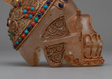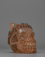 This skull head, which measures 11.5 cm in height by 8 cm in breadth and weighs 1.52 kg, is not only a beautiful decorative piece but also has profound spiritual significance. Precisely made by hand, it embodies the fine details of Tibetan artistry and is a potent symbol in Buddhist rituals, signifying the life-death-rebirth cycle. Perfect for collectors of great Tibetan art or spiritual practitioners, this item is an amazing fusion of beauty and significance.