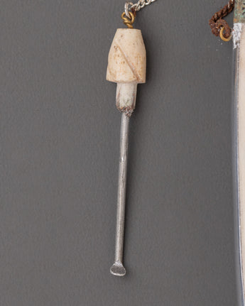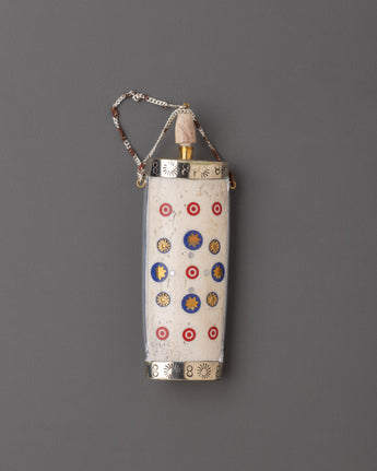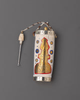 This handcrafted Tibetan snuff bottle is a striking example of Tibetan artistry, intricately painted with vibrant symbols that hold profound spiritual significance. Measuring 12 cm in height and 4.5 cm in width, this piece is crafted from ethically sourced buffalo bone and features white metal elements, offering both beauty and spiritual significance. The rich colors of red, blue, and gold capture the essence of Tibetan culture, while each motif is carefully selected to symbolize protection, spiritual harmony, and purity.