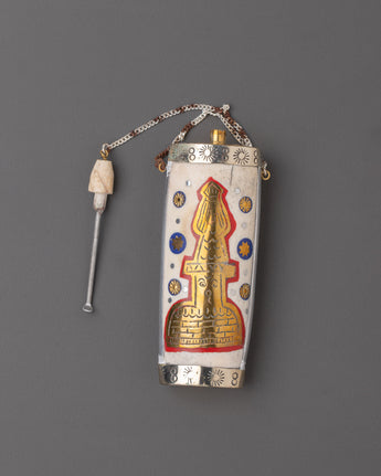 The artistry of this snuff container draws inspiration from centuries-old Tibetan traditions, which aim to protect and bring tranquility to the owner. It combines practical creativity with cultural history to offer a modern perspective on Tibetan spirituality. Display this precious relic in your home or meditation area to promote calm and spiritual connection. The metal details add to its attractiveness, making it a striking piece in any collection.
