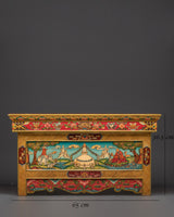 Crafted with precision, this Tibetan folding table, weighing 4.50 kg, is ideal for use in various places. The 37cm side width allows the table to carry a wide range of items, including candles, statues, and spiritual objects. The use of acrylic colors lends the table its magnificent brilliance, creating a fantastic appearance that adds spiritual depth to any home or meditation room. This table, whether put in a Buddhist shrine, living room, or meditation space, exudes tranquil energy.